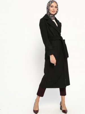 Miss Cazibe Siyah Kemerli Kaşe Kaban