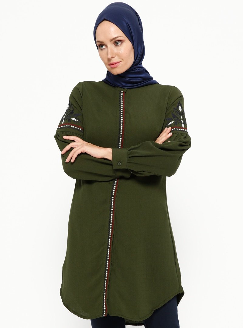 SUEM Haki Nakış Detaylı Gizli Düğmeli Tunik