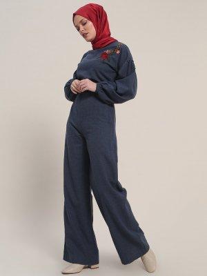 Refka Lacivert Doğal Kumaşlı Kemerli Tulum