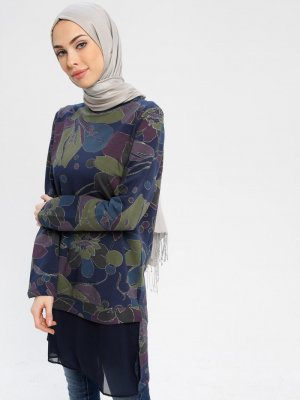 Tavin Lacivert Şifon Detaylı Desenli Tunik