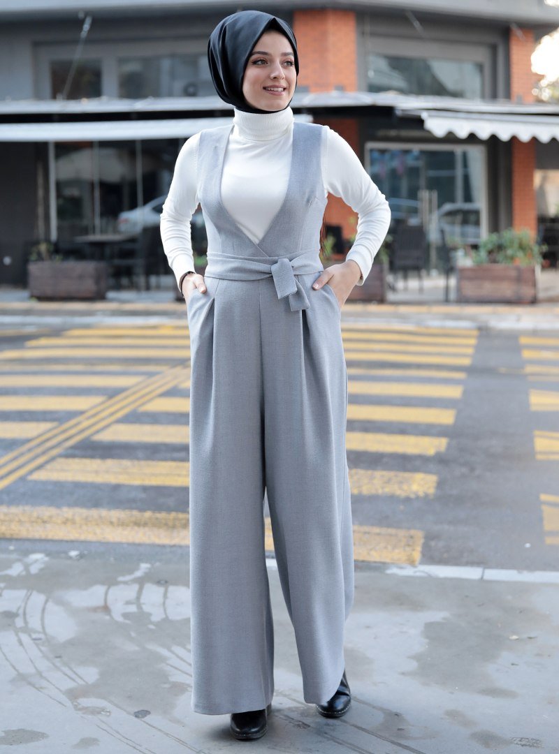 Zehrace Gri Kuşaklı V Yaka Tulum