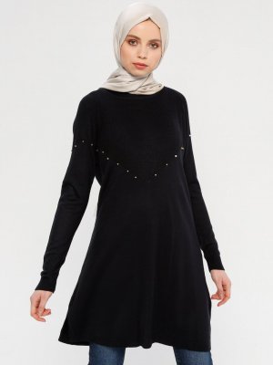 PINK APPLE Koyu Lacivert İncili Triko Tunik