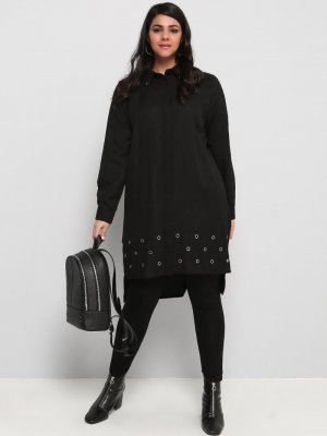 Alia Siyah Kuş Gözü Detaylı Gizli Düğmeli Tunik