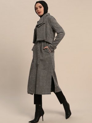 Refka Siyah Doğal Kumaşlı Desenli Trençkot