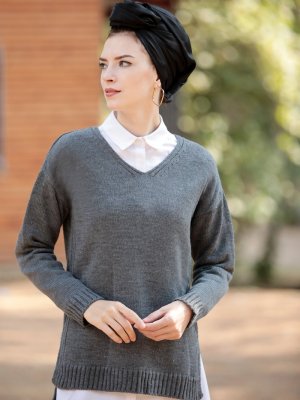 Selma Sarı Design Antrasit V Yaka Fitilli Triko Kazak