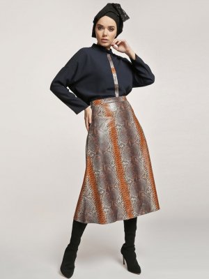 Nilüfer Kamacıoğlu Lacivert Taba Deri Etekli 2'li Takım