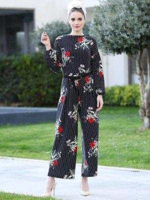 Selma Sarı Design Siyah Bordo Çiçek Desenli Tulum