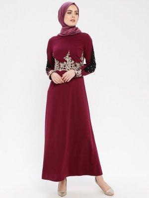 Duru Giyim Mürdüm Güpür ve Boncuk Detaylı Elbise