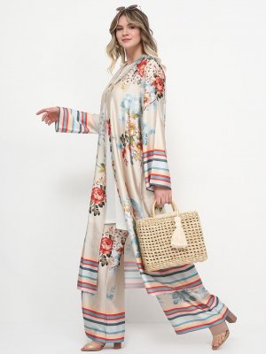 Alia Bej Çiçek Desenli Bol Paça Pantolon