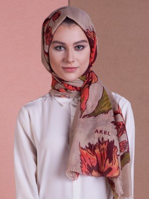 Akel Oranj Yeşil Kesik File Baskılı Şal