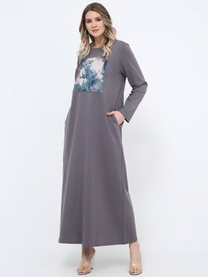 Alia Gri Doğal Kumaşlı Baskılı Elbise
