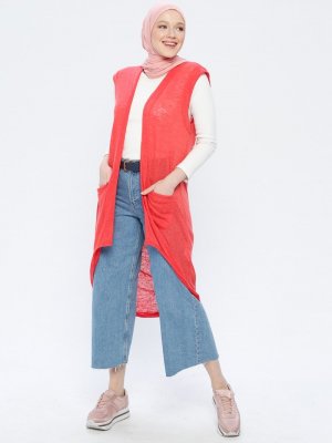 Zentoni Kırmızı Kolları Bantlı Örme Cepli Hırka