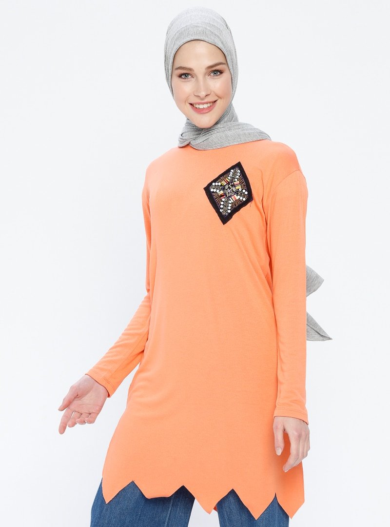 Zentoni Turuncu Asimetrik Kesim Boncuk Detaylı Tunik