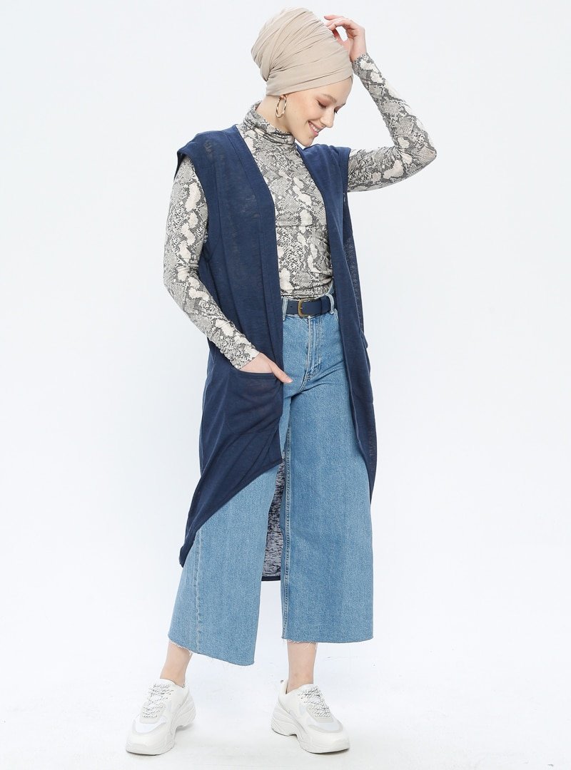 Zentoni Lacivert Kolları Bantlı Örme Cepli Hırka