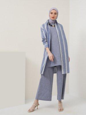 Benin Lacivert Doğal Kumaşlı Çizgili Tunik
