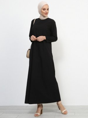 Refka Siyah Doğal Kumaşlı Sırtı Düğmeli Elbise