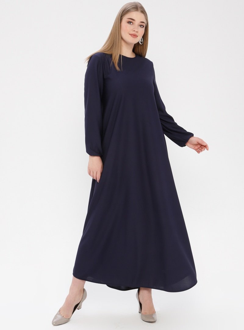 ECESUN Lacivert Bilekleri Lastikli Elbise