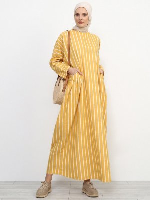 Refka Hardal Doğal Kumaşlı Çizgili Keten Elbise
