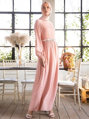 Refka Pembe Doğal Kumaşlı Puantiyeli Elbise