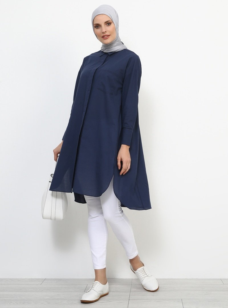 Refka Lacivert Doğal Kumaşlı Gizli Düğmeli Tunik