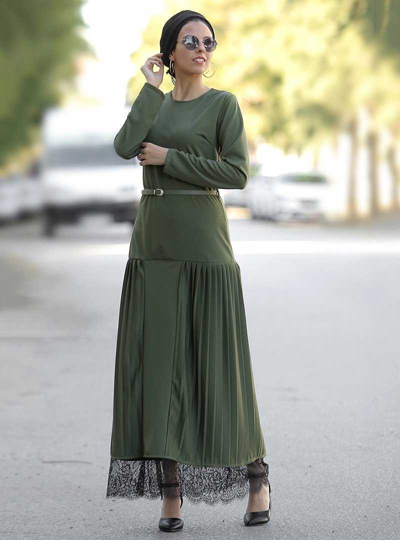 Por La Cara Haki Etek Ucu Pileli Kemerli Elbise