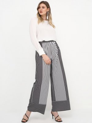 Alia Siyah Beyaz Beli Lastikli Geniş Paça Pantolon