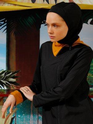 Mayovera Siyah Hardal Hardal Yaka Fermuarlı Tasarım Tam Kapalı Mayo