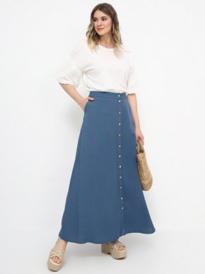 Alia İndigo Boydan Düğmeli Keten Etek