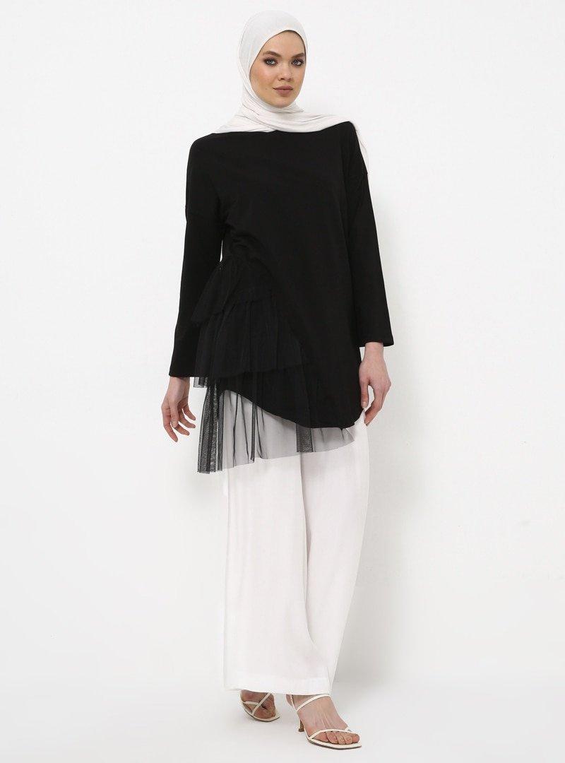 Rabia Z X Modanisa Siyah Doğal Kumaşlı Tül Detaylı Tunik