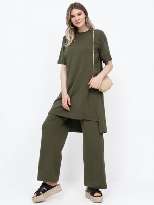 Alia Haki Doğal Kumaşlı Beli Lastikli Pantolon