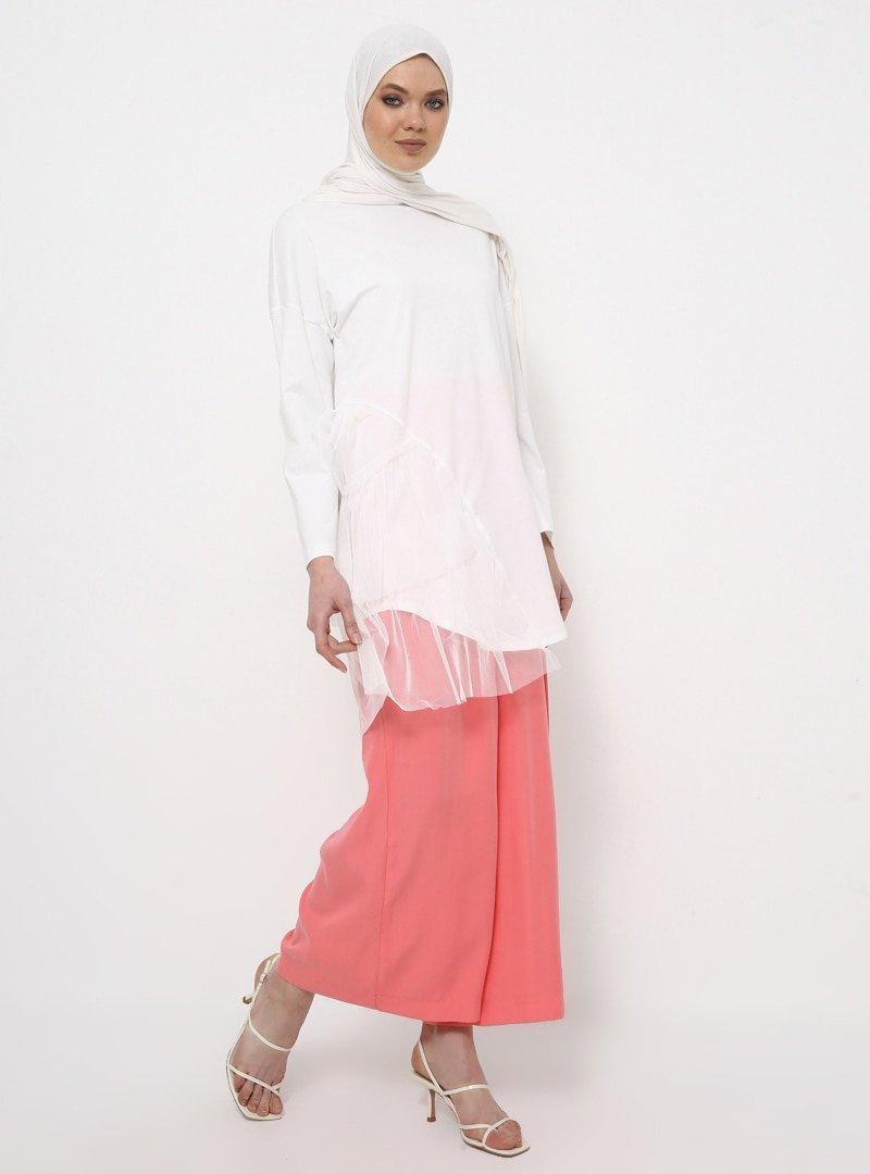 Rabia Z X Modanisa Ekru Doğal Kumaşlı Tül Detaylı Tunik