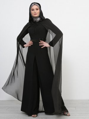 Refka Siyah Pelerinli Payet İşlemeli Hakim Yaka Tulum