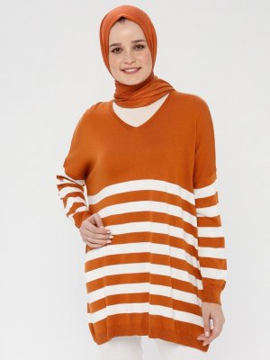 Zentoni Bakır Ekru Triko Çizgili Salaş Tunik