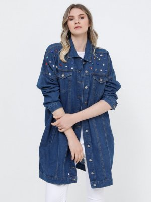 Alia Koyu Mavi Doğal Kumaşlı Taş Detaylı Kot Ceket