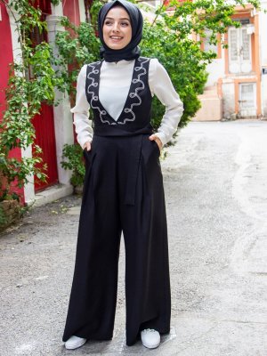 Zehrace Siyah Nakışlı Tulum