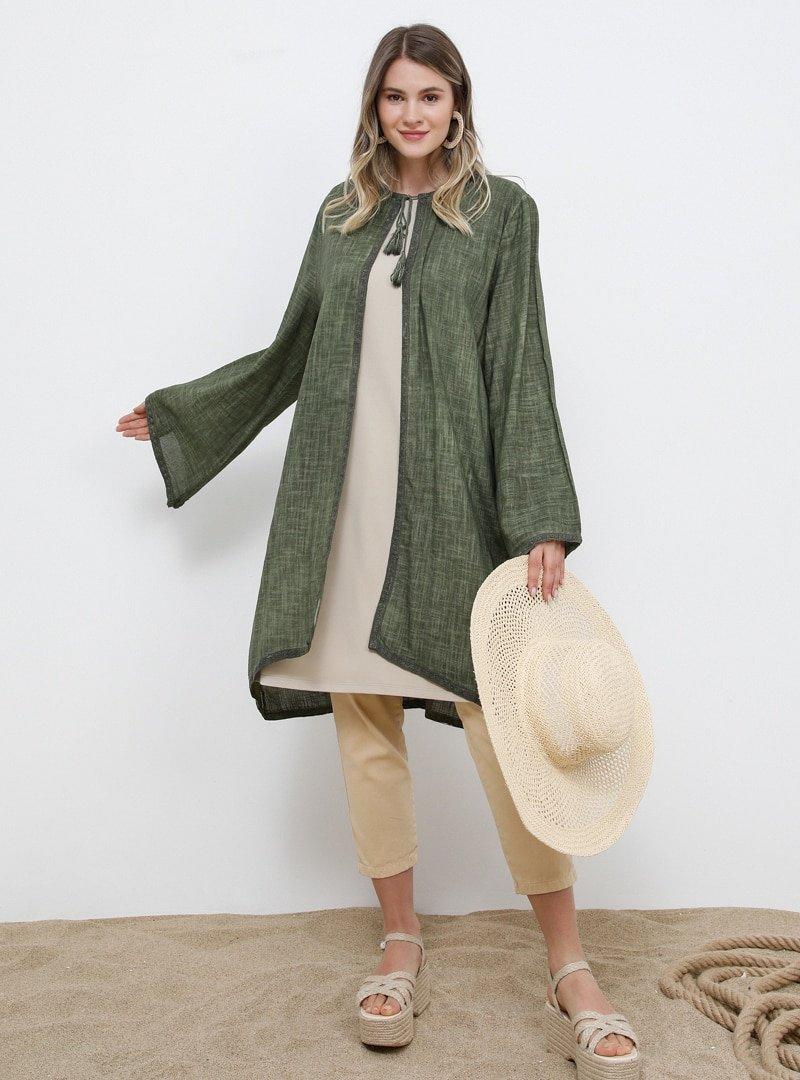 Alia Haki Doğal Kumaşlı Yakası Bağcık Detaylı Kap