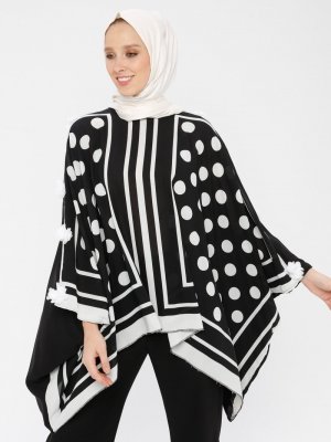 Tuncay Siyah Ekru Çiçek Detaylı Puantiyeli Panço