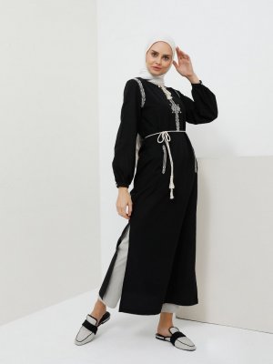 Benin Siyah Yakası Fermuarlı Nakışlı Elbise
