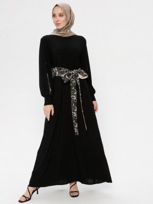 AİŞE MODA Siyah Bej Dantel Kemerli Elbise