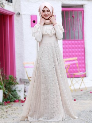 Gamze Özkul Ekru Vintage Dantel Detaylı Abiye Elbise