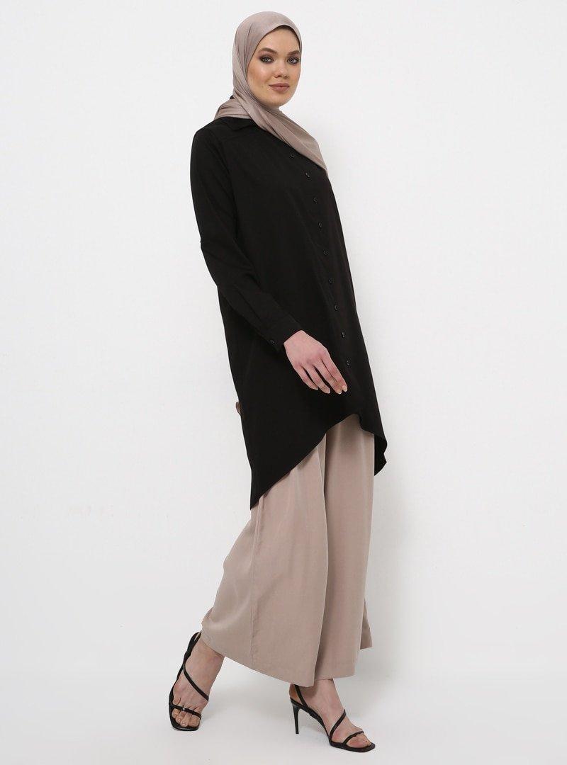 Rabia Z X Modanisa Siyah Doğal Kumaşlı Asimetrik Kesim Tunik