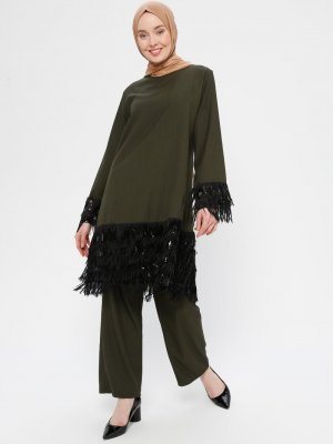 BÜRÜN Haki Püskül Detaylı Tunik & Pantolon İkili Takım