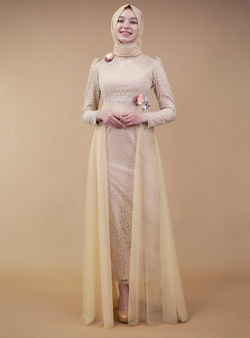 Sew&Design Bej Çiçekli Aplik İşlemeli Abiye Elbise
