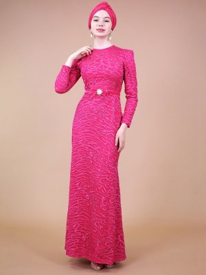 Sew&Design Fuşya İncli Kemerli Dantel Abiye Elbise
