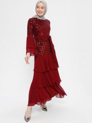BÜRÜN Bordo Payet İşlemeli Abiye Elbise