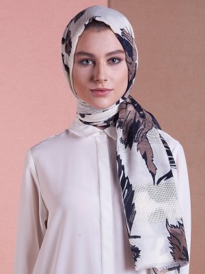 Akel Ekru Lacivert Kesik File Baskılı Şal