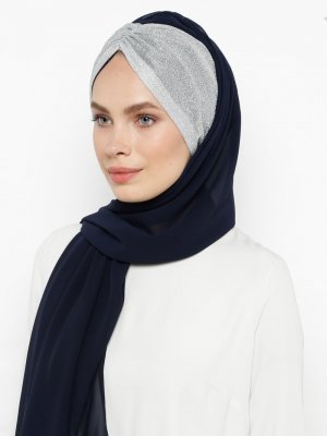 Miray Lacivert Gümüş Abiye Hazır Türban