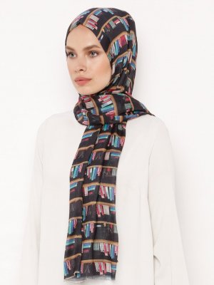 Soft Scarfs Siyah Kitap Desenli Krep Şal