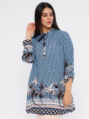 Genç Style Mavi Düğme Detaylı Desenli Tunik