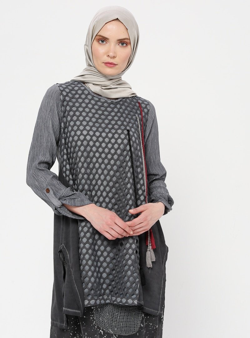 RED`SHE Antrasit Püskül Detaylı Tunik